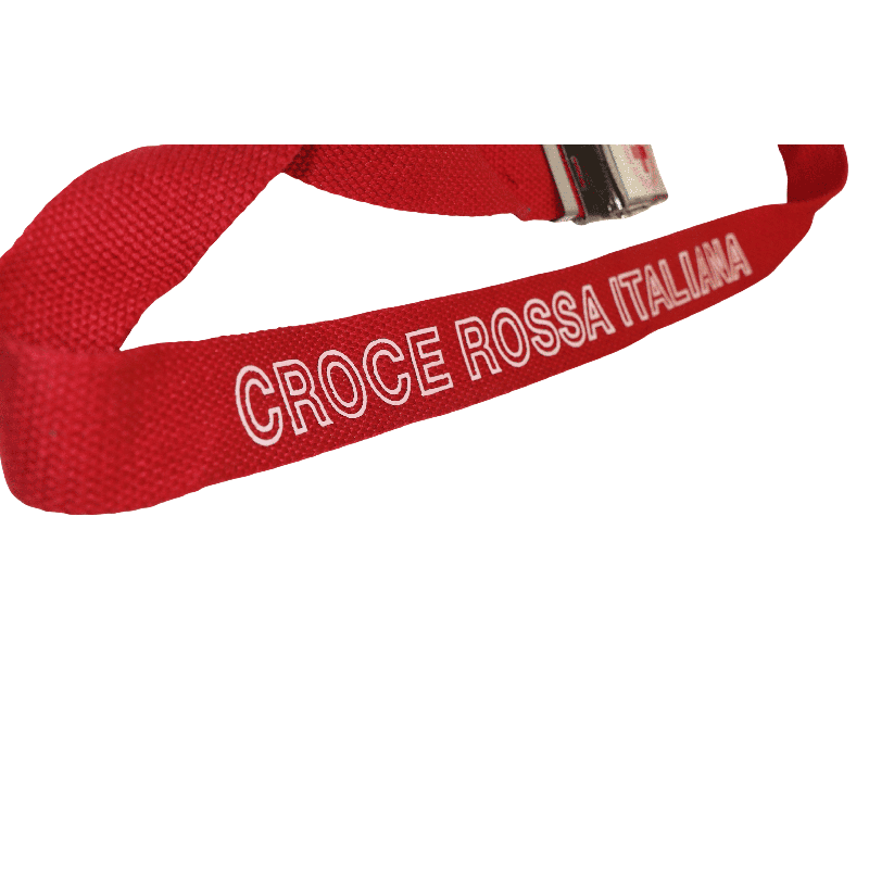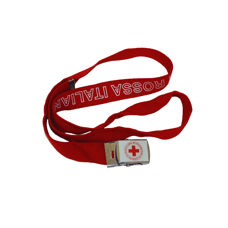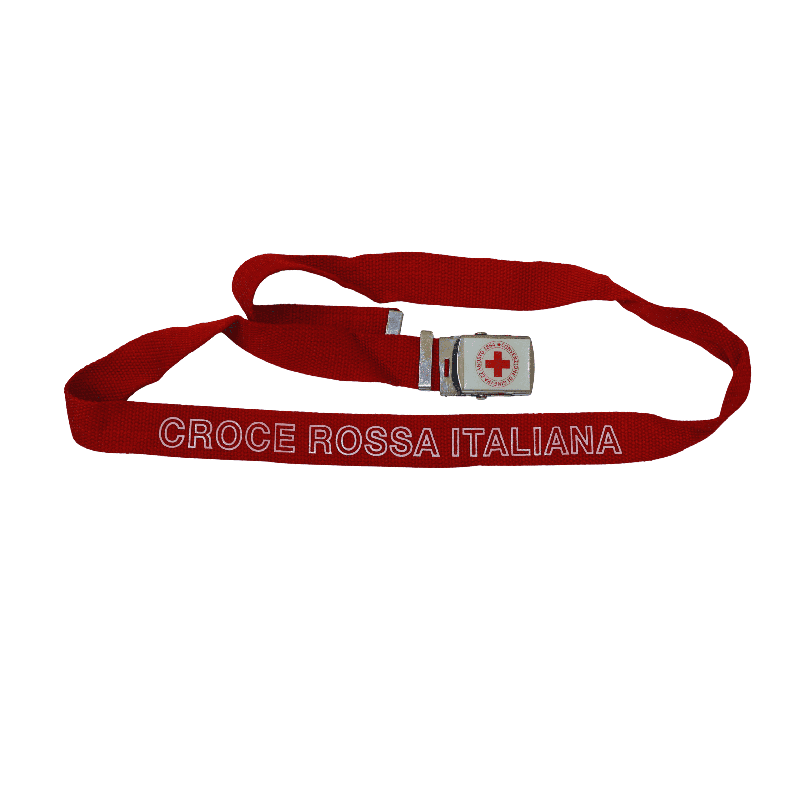 Cintura in tessuto Croce Rossa Italiana realizzata in nastro resistente di colore rosso, con scritta istituzionale bianca ben visibile e fibbia metallica con emblema CRI. Un accessorio pratico e affidabile, pensato per completare l’uniforme di servizio e garantire comfort e riconoscibilità durante le attività operative.
