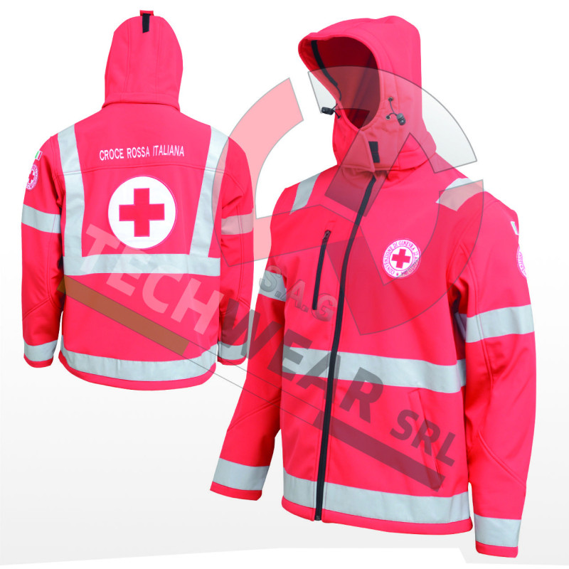 Giubbino Softshell della Croce Rossa Italiana, un capo tecnico di colore rosso dotato di cappuccio e numerose bande riflettenti per l'alta visibilità. La giacca presenta il logo istituzionale CRI di grandi dimensioni sul retro e i distintivi ufficiali sul fronte e sulle maniche, offrendo una protezione completa e professionale per gli operatori autorizzati in servizio esterno.