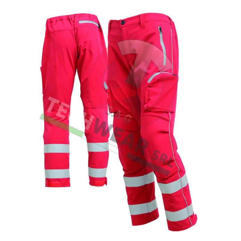 Pantalone Operativo della Croce Rossa Italiana, caratterizzato da un design tecnico e multitasche. Di colore rosso con ampie bande riflettenti grigie sulla parte inferiore, il pantalone presenta rinforzi sulle ginocchia e profili catarifrangenti laterali per la massima sicurezza. Dotato di tasconi capienti e regolazioni a velcro sulle caviglie, rappresenta l'elemento base per l'equipaggiamento operativo autorizzato.